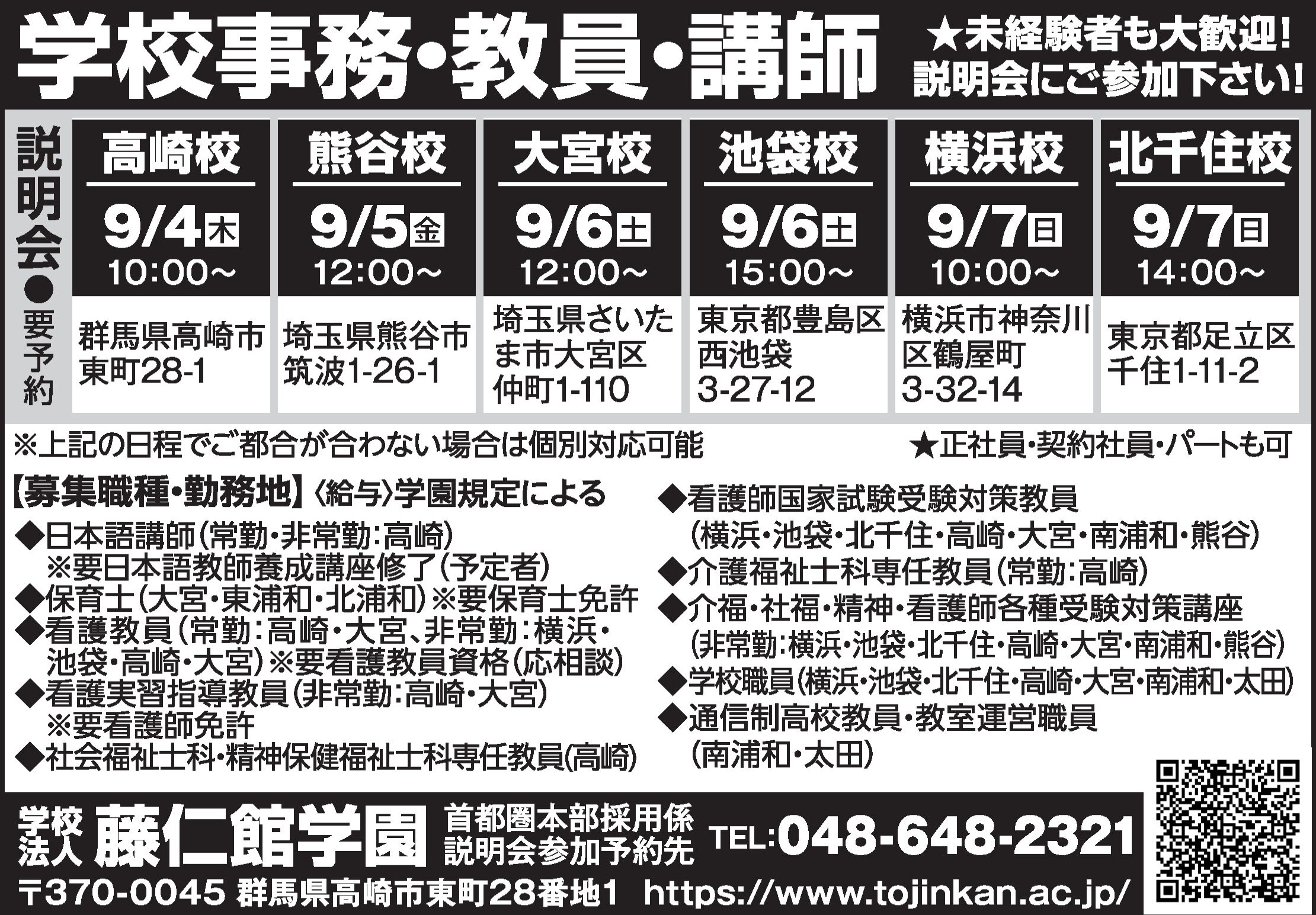 説明会参加は電話:048-648-2321