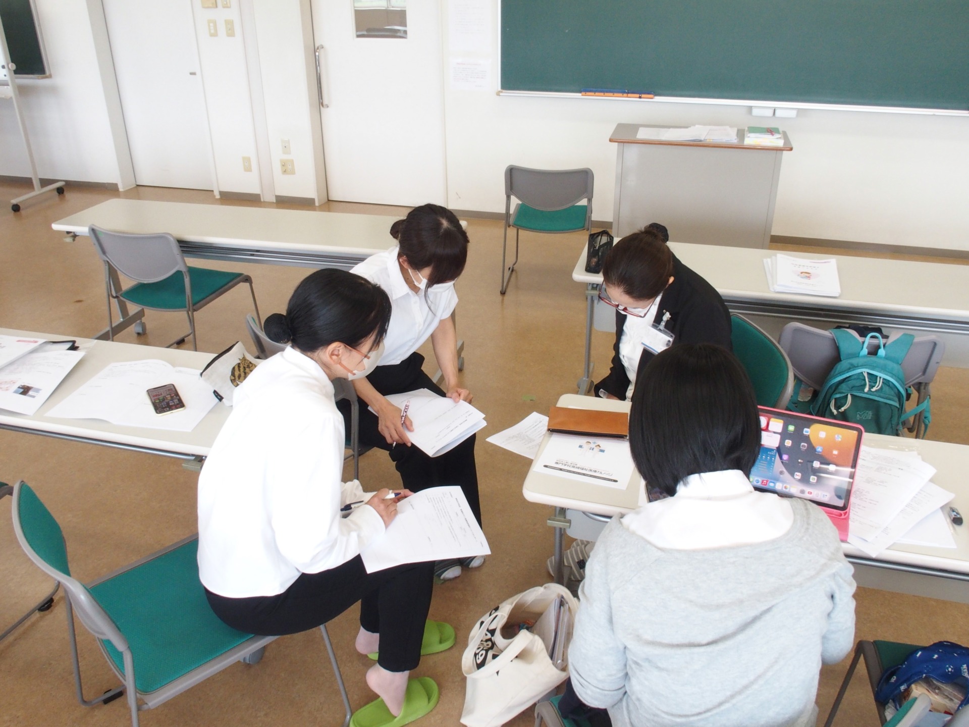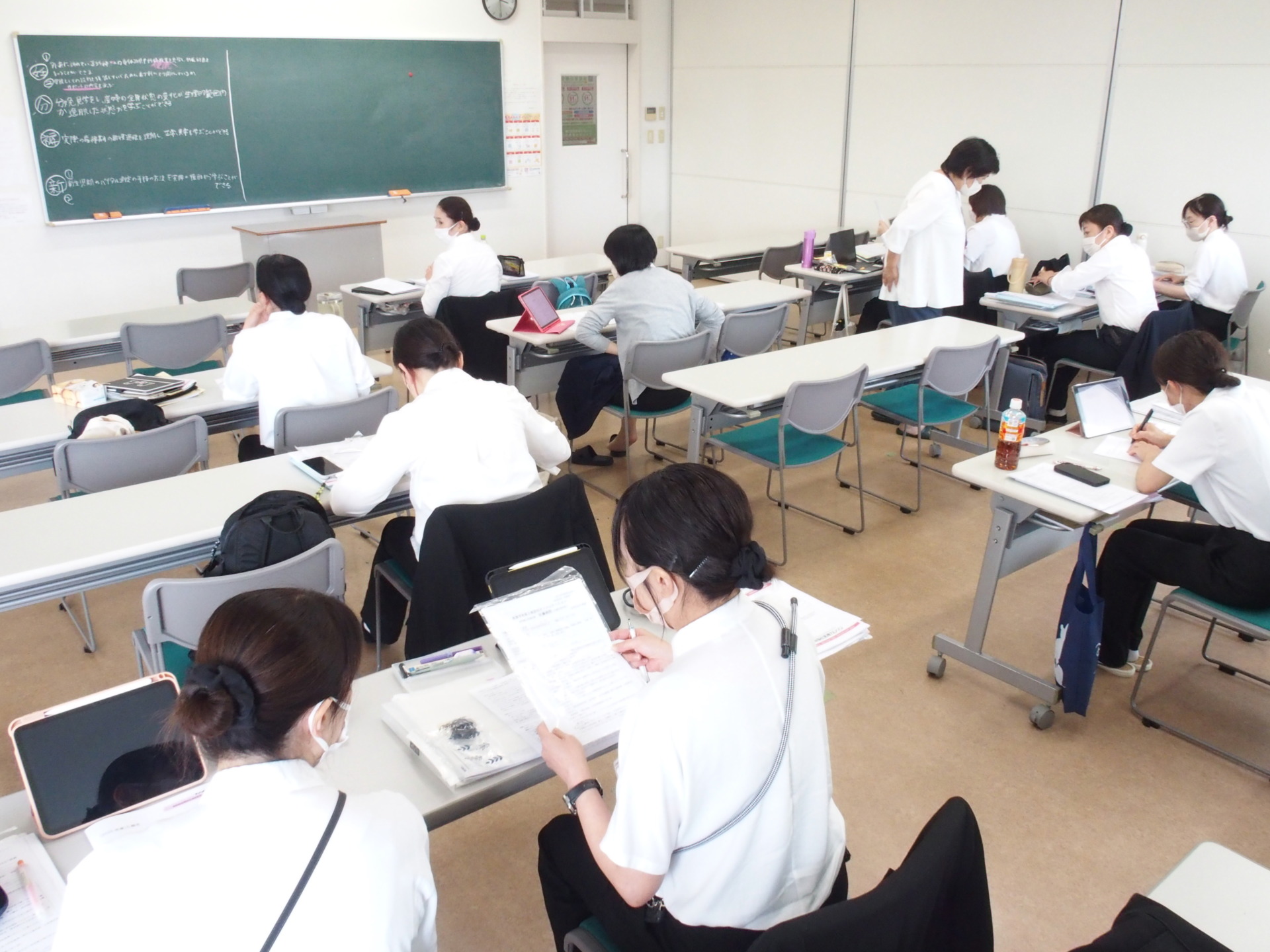 本日、高崎高松町キャンパスにて1年生に対する「母性看護学実習前B日程スクーリング」を行いました。14名の学生が出席。実習前スクーリングでは、①実習施設のオリエンテーション、②実習目標の立案、③領域の事前学習が主な授業内容となります。グループ分かれて、それぞれ実習目標を学生同士で話し合いな立案しておりました。また、事前学習は与えられて課題を、教科書を参考しにしながら学習しておりました。