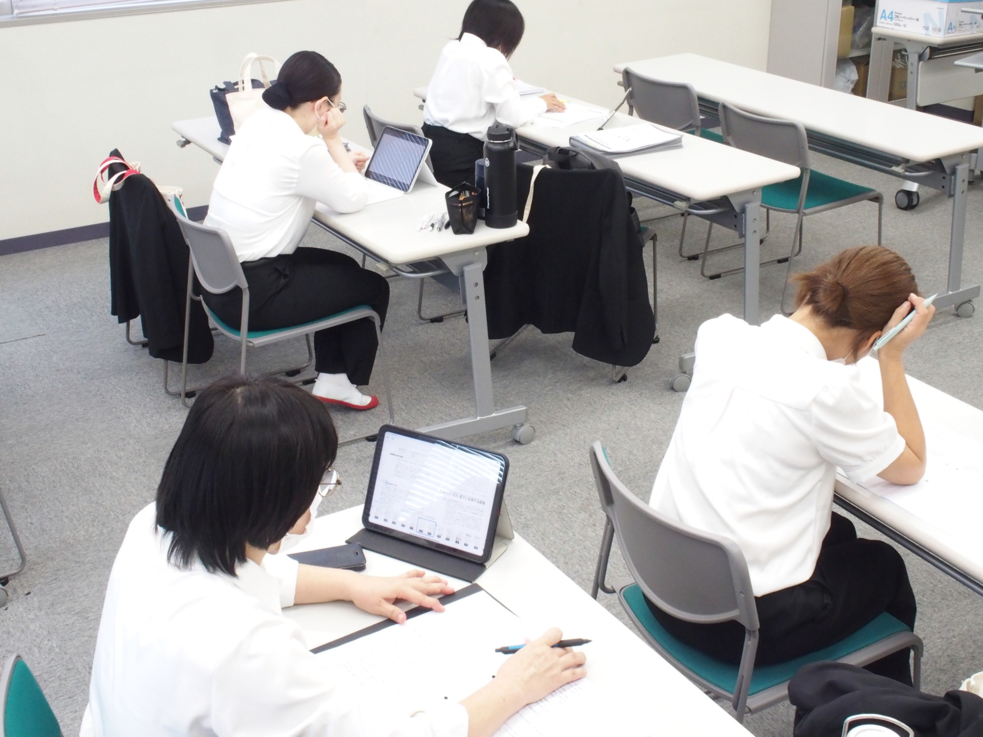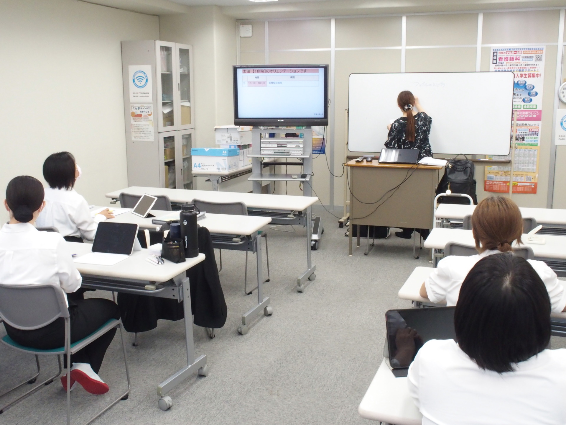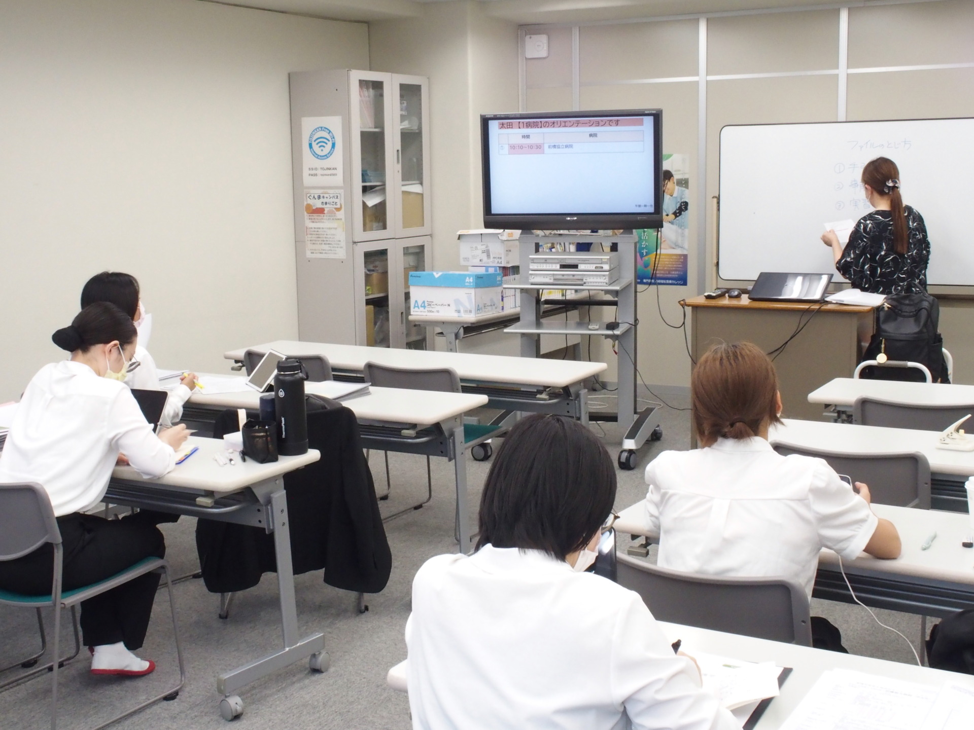 本日、太田キャンパスにて1年生に対する「老年看護学実習前スクーリング」を行いました。授業内容は①実習施設のオリエンテーション、②実習目標の立案、③領域の事前学習が主な内容となります。学生は2日間分の実習目標を立案しておりました。1日2つの実習目標を立案、合計4つの目標を立案しておりました。教員に個別で自分の考えや経験を踏まえて、積極的に相談しながら立案をしておりました。学生の個別対応ができるのも当校の魅力のひとつです!