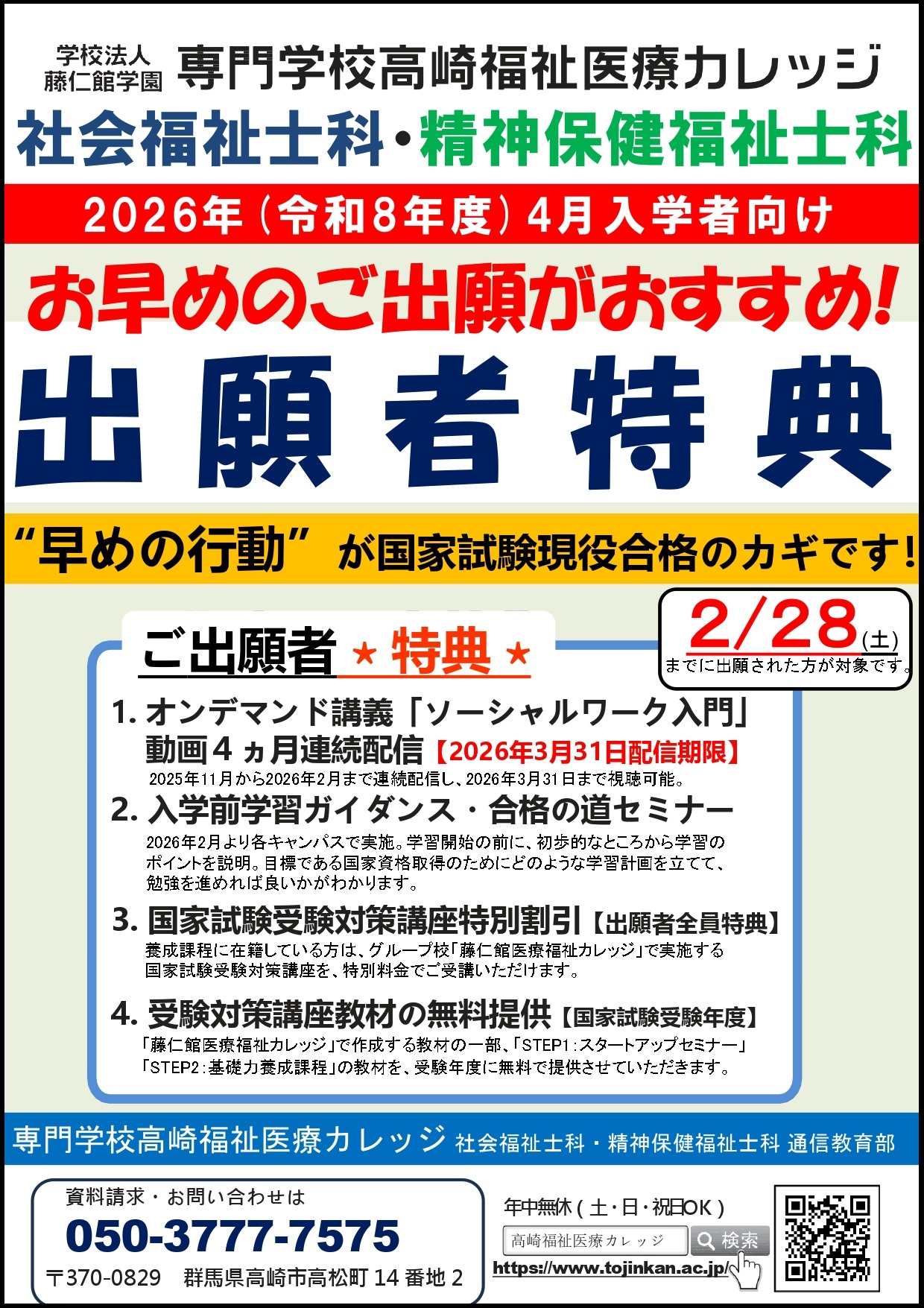 【社会・精神】★出願4大特典★早めのご出願がおすすめ!【2/28まで】(2026年入学)
